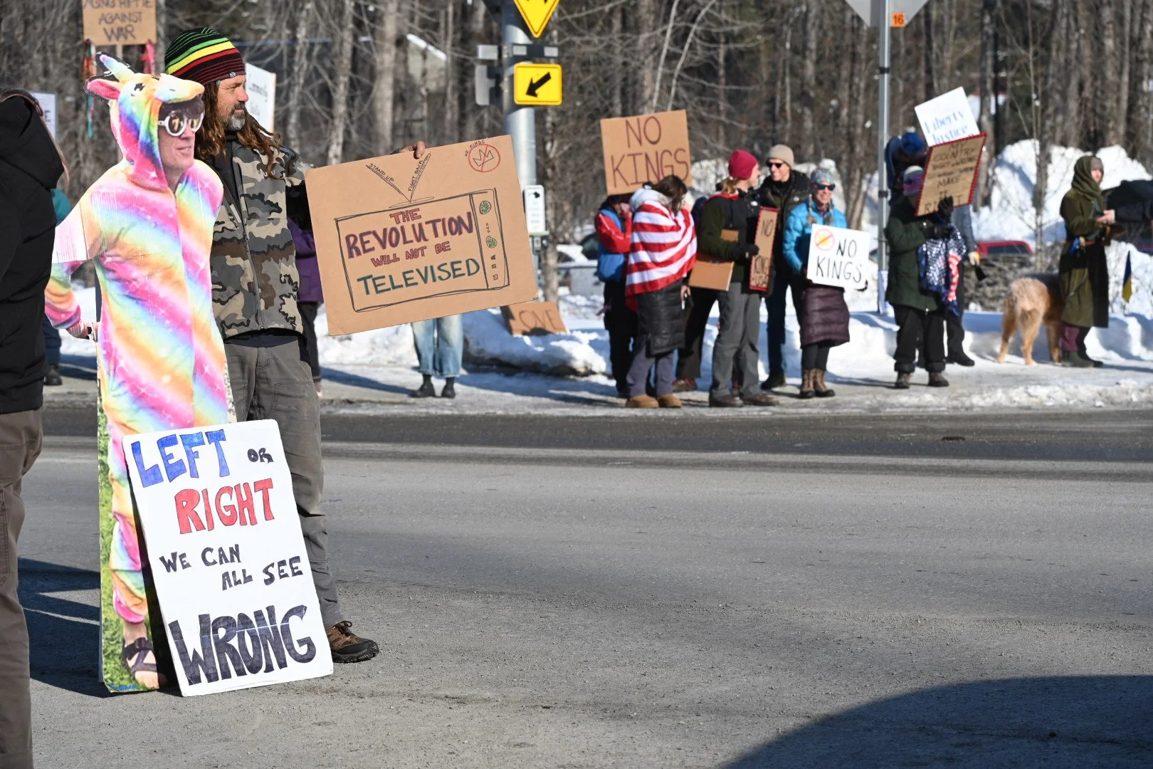Despite a biting cold, protesters stood at the corner of Alyeska and Hightower for more than an hour. Jacky Graham held out for most of that time before bundling up her sign to leave.