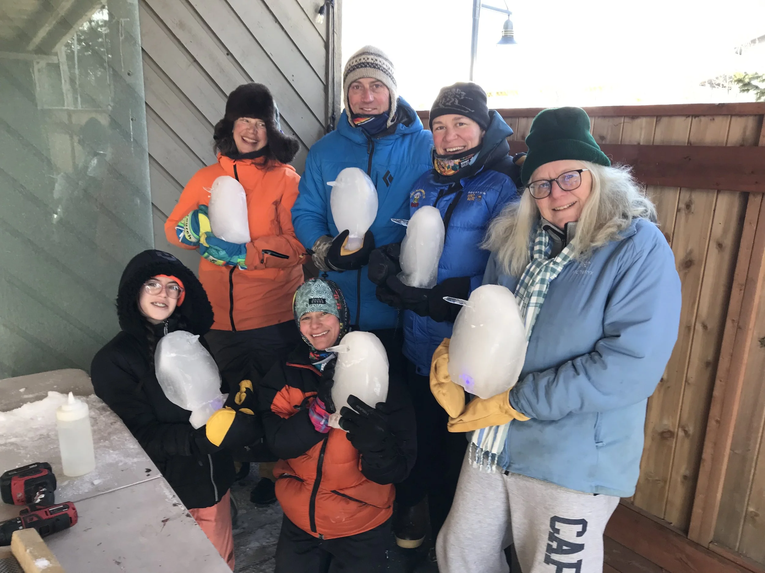 The Girdwood Art Institute / Girdwood Fine Arts Camp winter series sponsored an ice carving class on Saturday. The class was hosted by RAW Market on their back porch. The students successfully completed their first ice carving sculptures. Penguins! The un-Alaskan birds were carved from 10-pound blocks of ice with icicles for their beaks. (Photos courtesy of Tommy O’Malley)