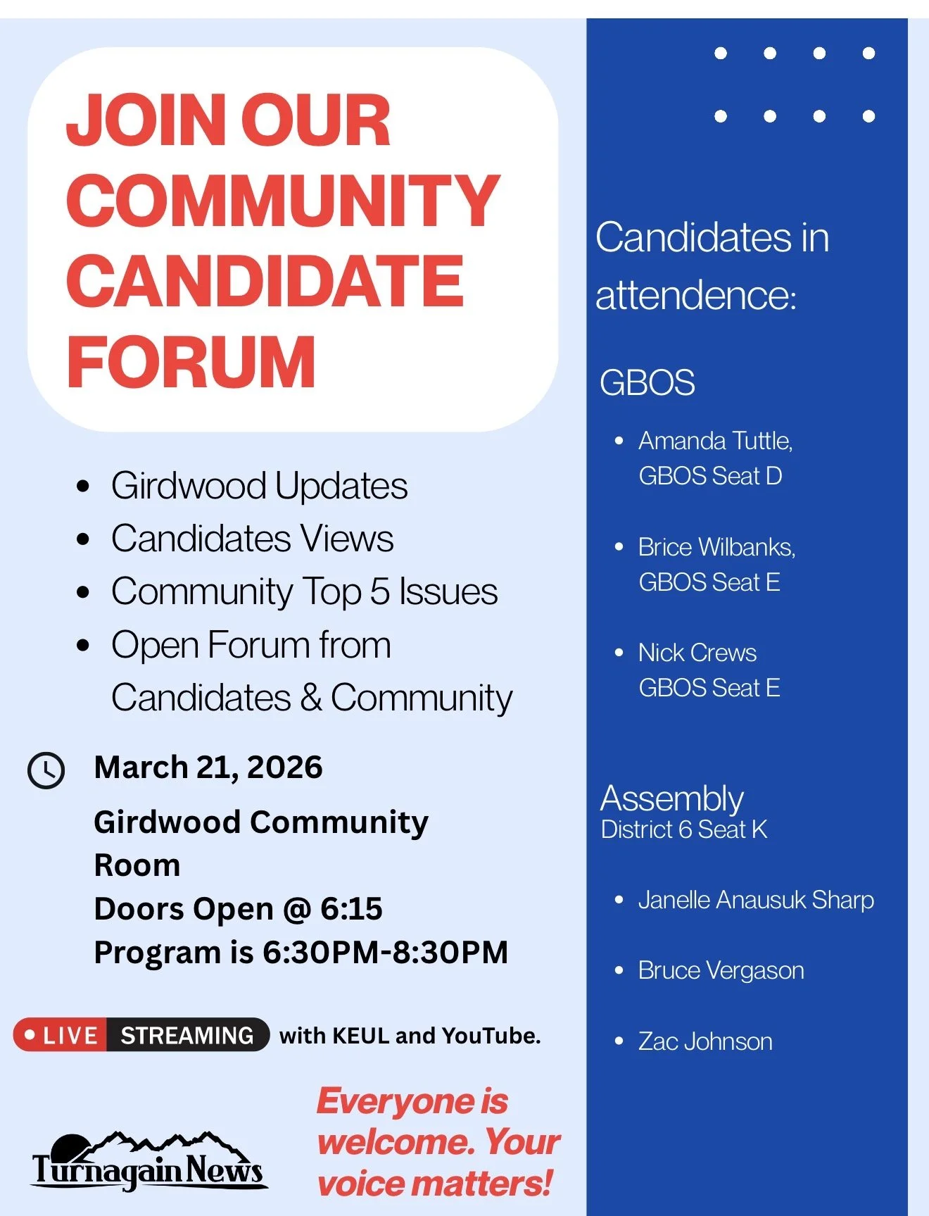 The Turnagain News Board of Directors is planning an Election Candidates Forum for March 21 at the Girdwood Community Room. Volunteers are needed from 6 to 9 p.m. to support the event with duties such as setup and tear down. Please email event organizer Grace Pleasants at grace.pleasants@gmail.com if you can provide support for partial or the complete event.