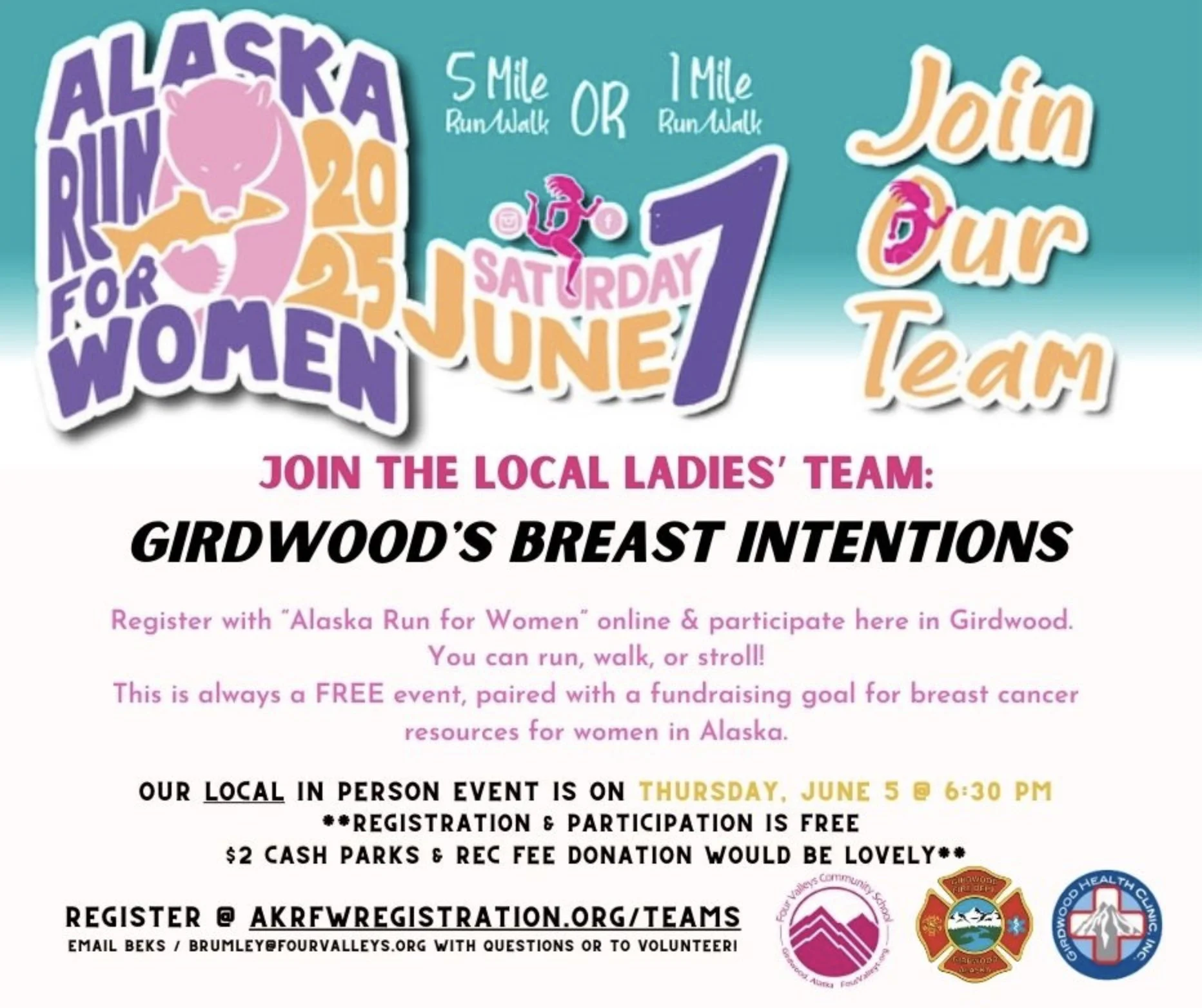 Girdwood's event will be Thursday, June 5, starting at 6:30 p.m. at the Magic Carpet. Sign up for Girdwood's Team!” she exclaimed.