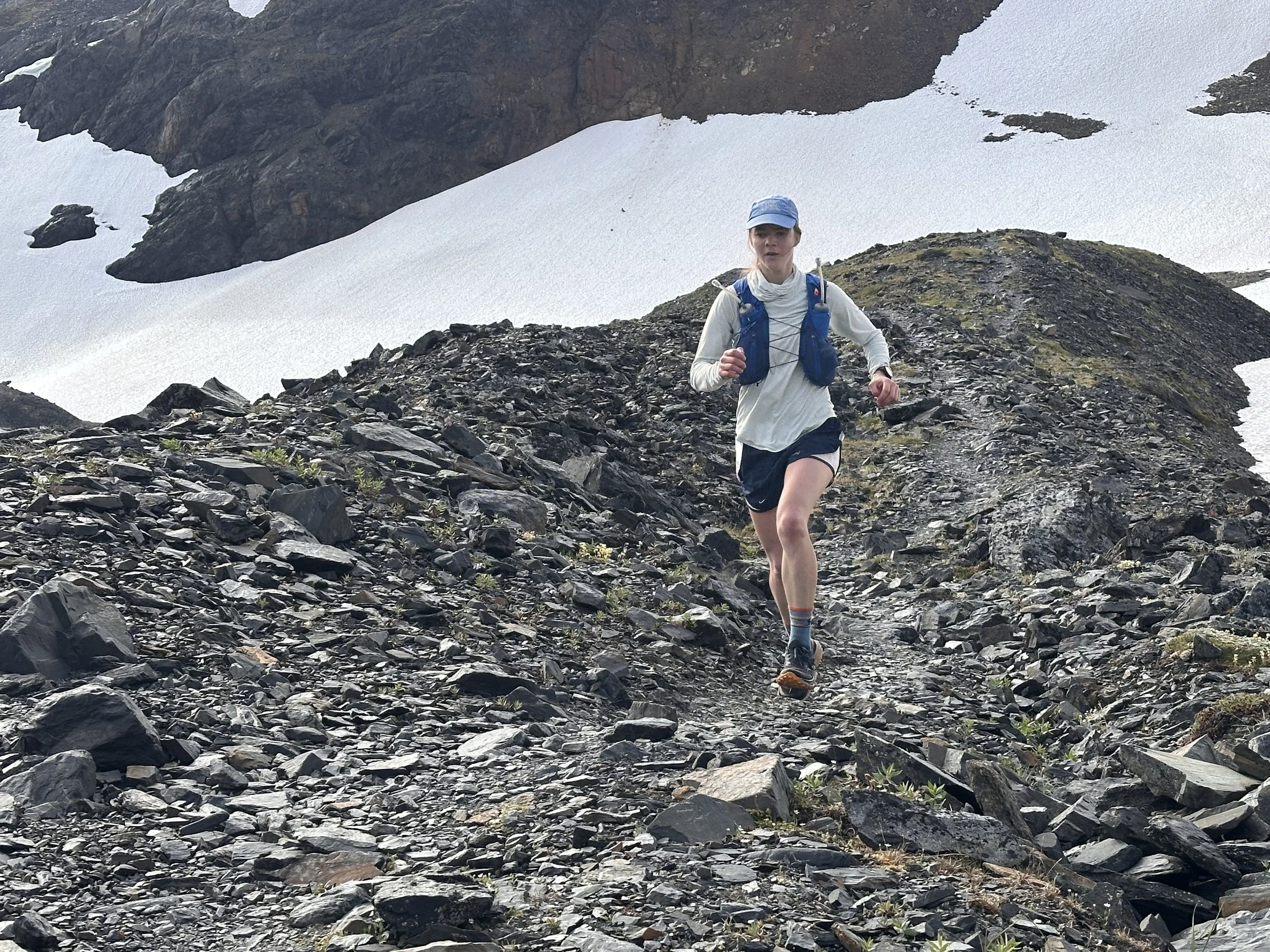 A runner cruises gingerly along a morraine spine.