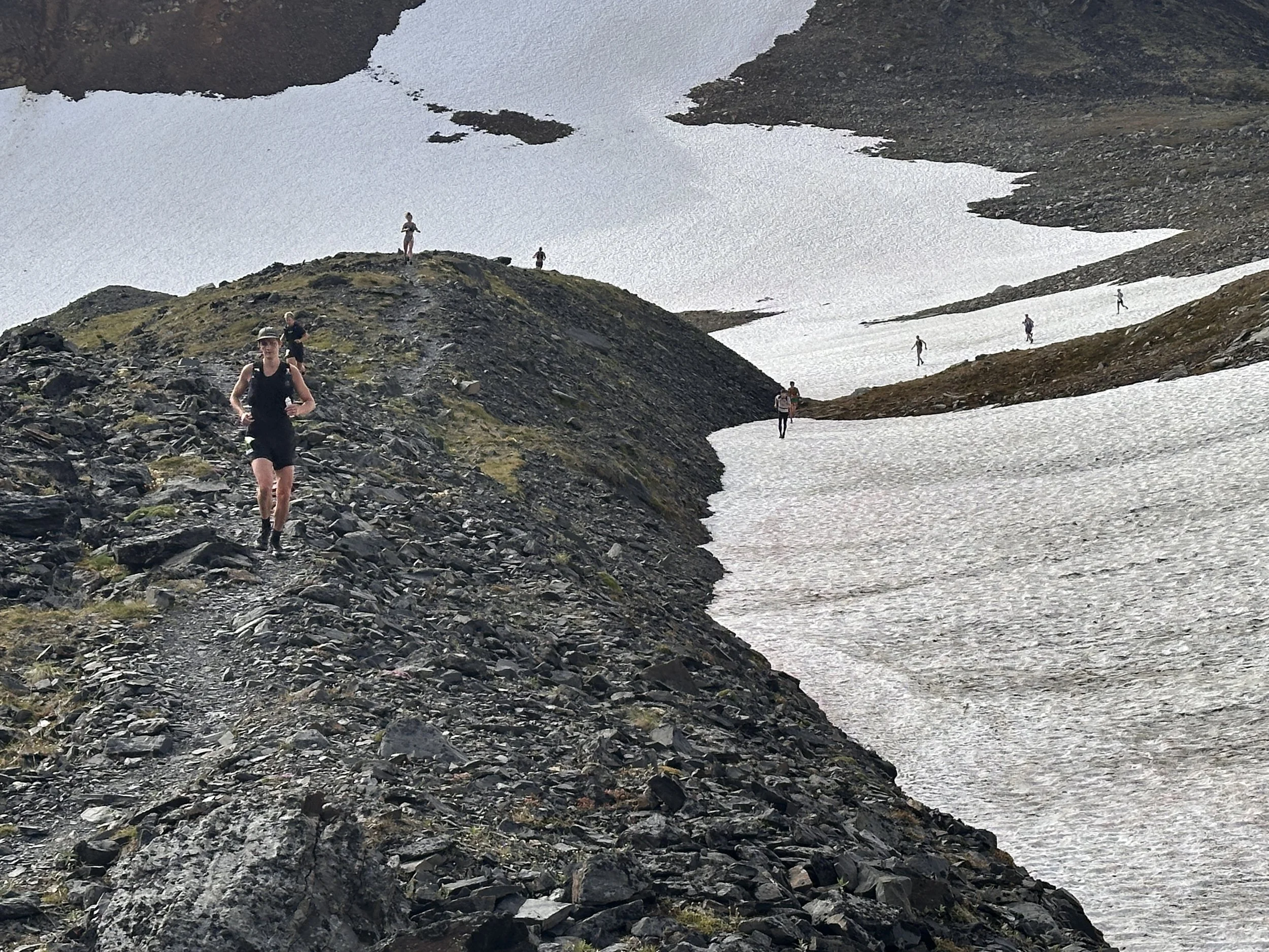 Runners descend from Crow Pass into Raven Cree Valley.