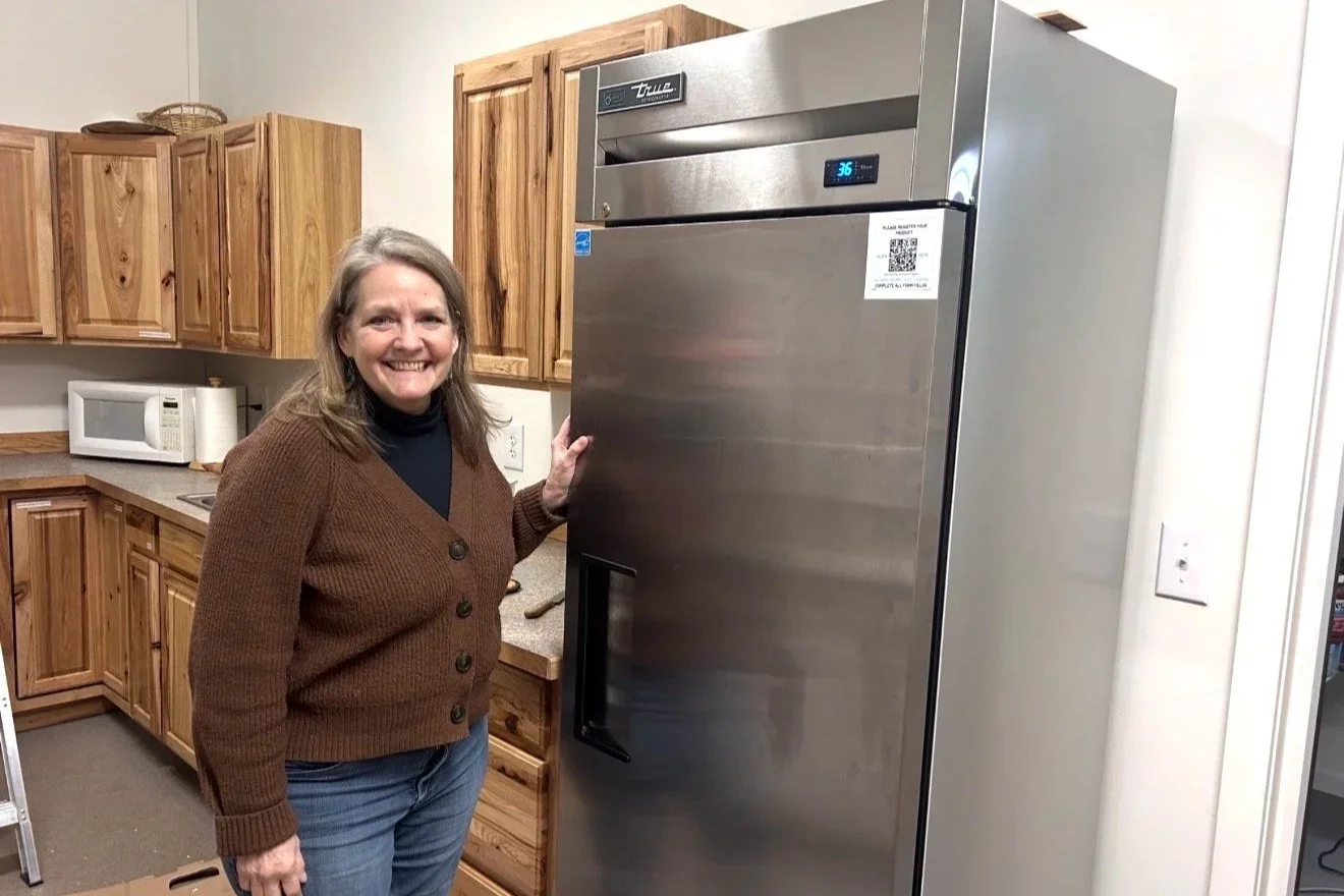 Girdwood Food Pantry Director Terry Sherwood poses with a refrigerator purchased with recent grant funding. (Photo by Allison Sayer)