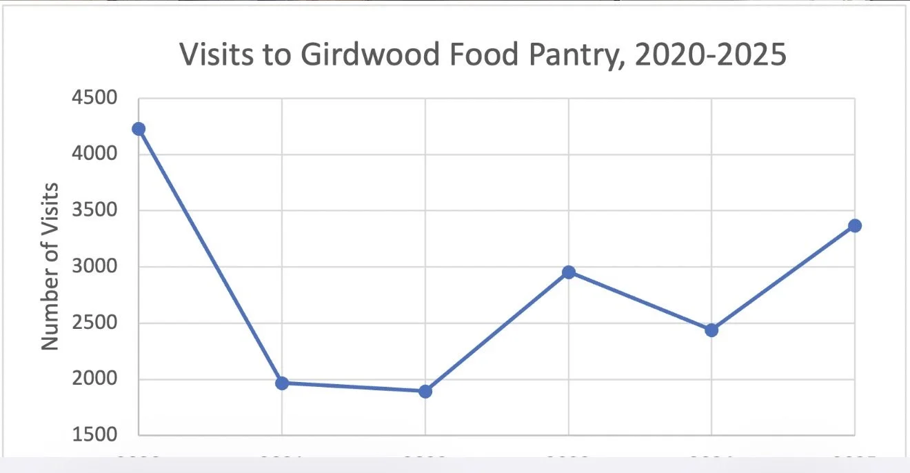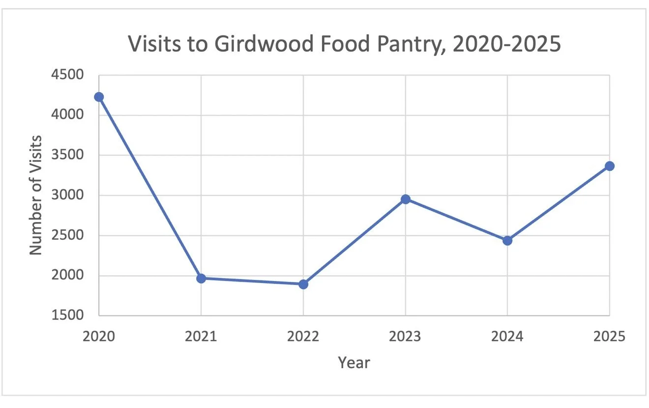 In 2025, as of December 16, the Girdwood Food Pantry provided approximately 3370 food services. That figure comprises both one-time visitors and the sum of multiple visits by the same individual. Sherwood estimates 332 unique people from 195 households were served in 2025, as of December 16.