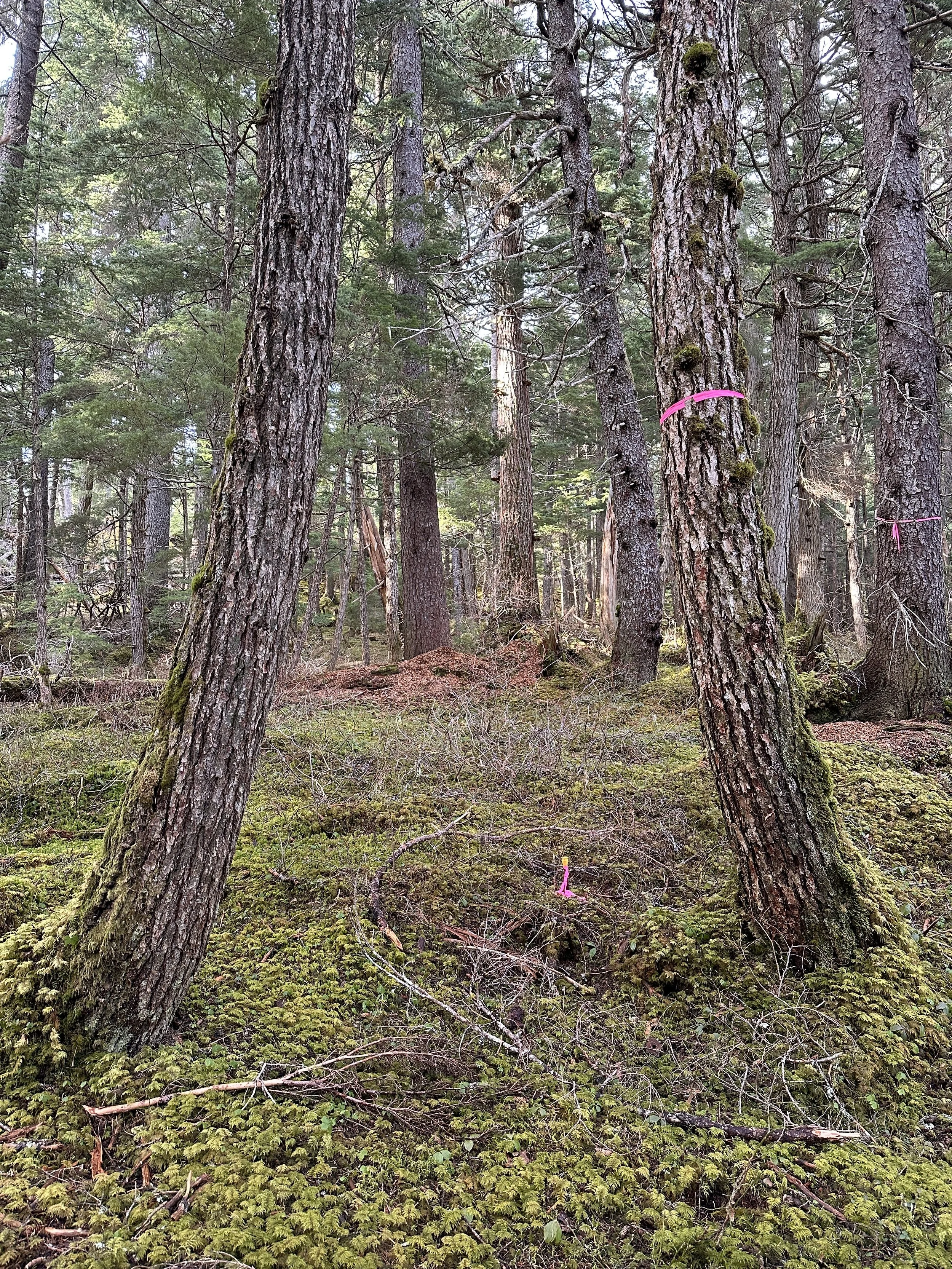 Survey tape indicates path of eradication of forested hills and meadows between Crow Creek Road and Glacier Creek in the area dubbed "Holtan Hills". (Photo by Soren Wuerth)