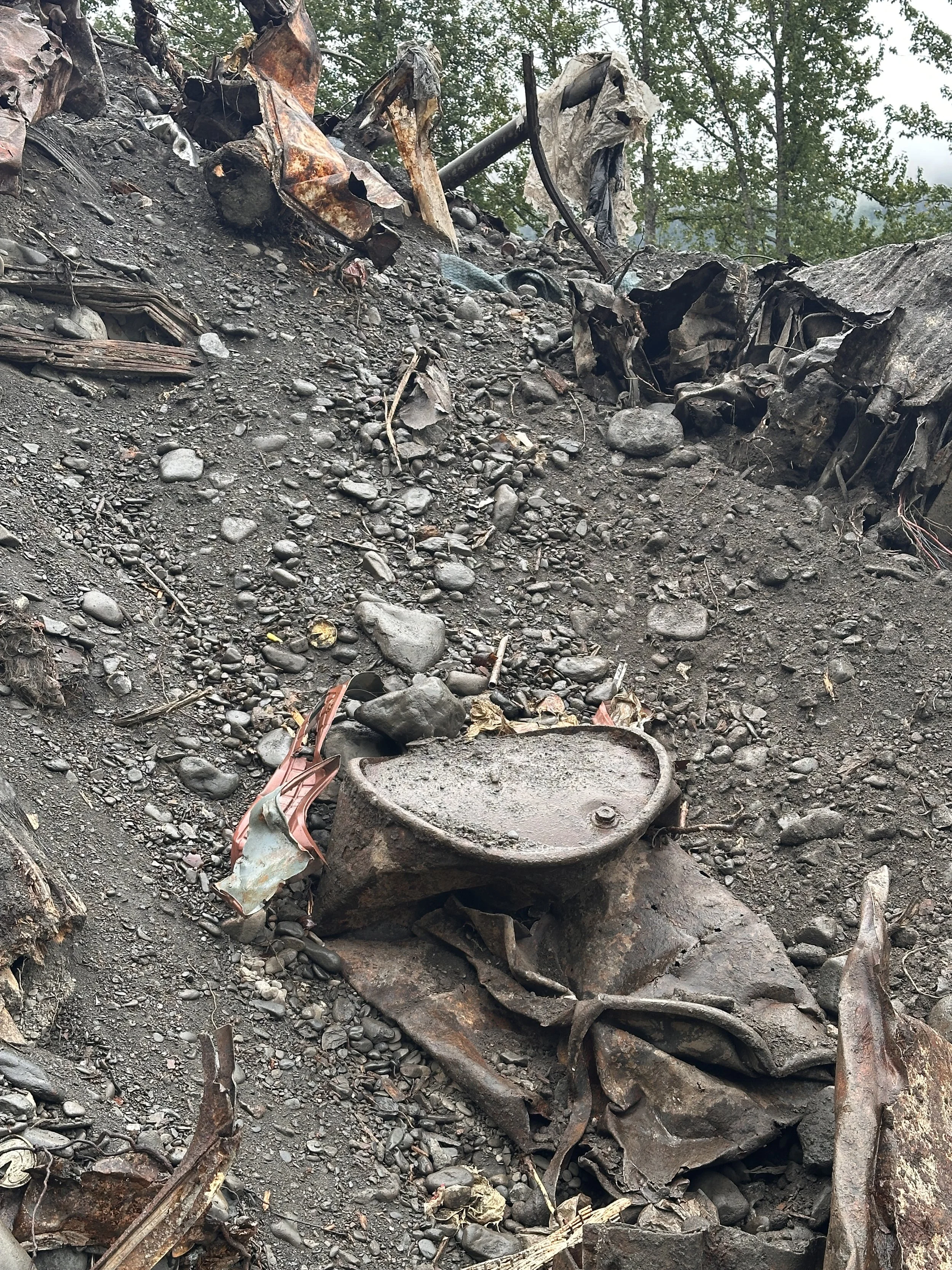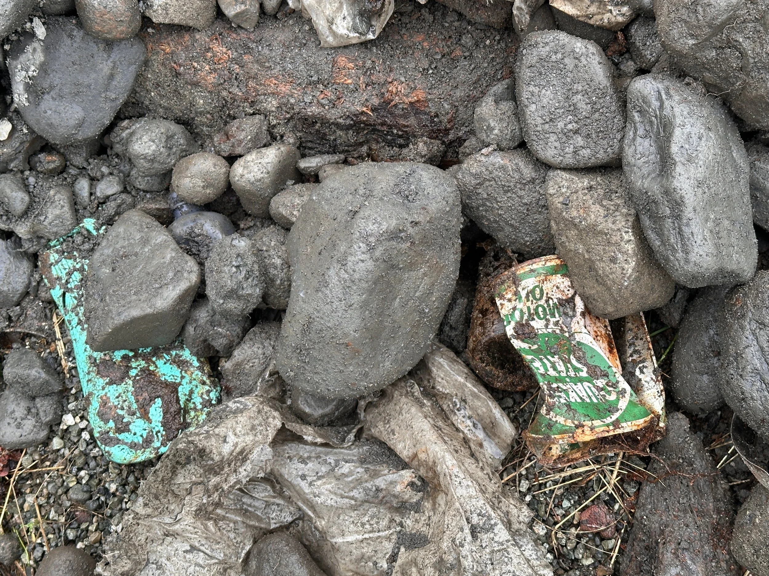 Remnants of a decades-old garbage dump found during construction were uncovered Monday. Refuse contains car parts, oil canisters, garbage bags and even a coffee mug. (Photo by Soren Wuerth)