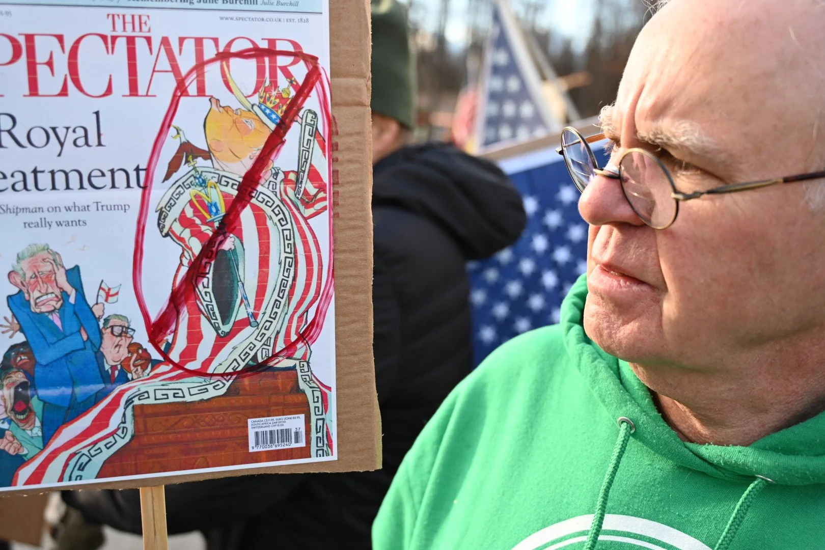 Tommy O'Malley holds a magazine cover for a Scottish news magazine printed during Trump's visit to Scotland. (Photo by Soren Wuerth)