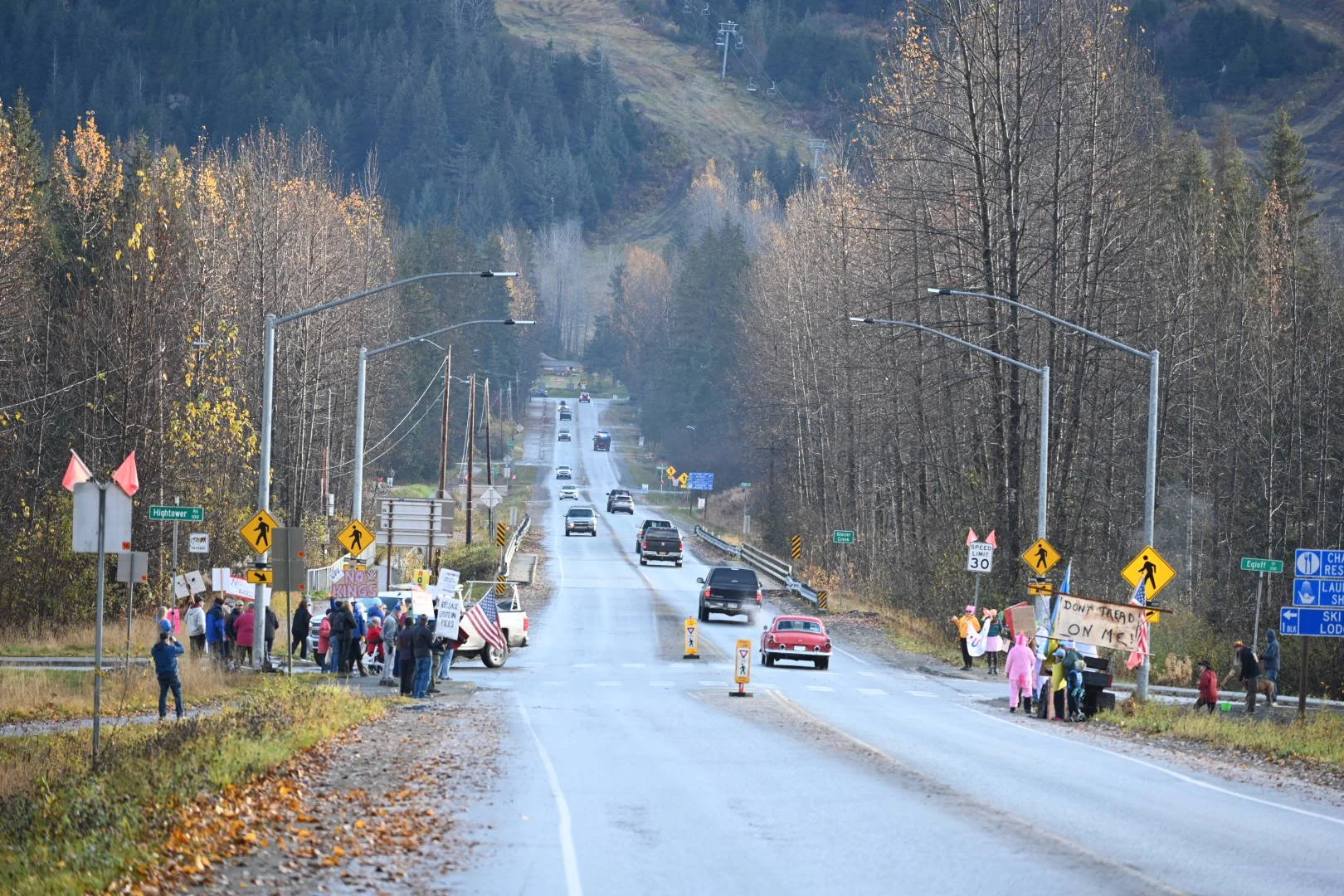 About 70 locals showed up for Girdwood's "No Kings" Saturday to demonstrate against the policies of the current administration. Girdwoodians, peaceably assembled on the corner of Hightower and Alyeska, raised posters, peace signs and fists joining in demonstrations held across the planet to protest authoritatian rule